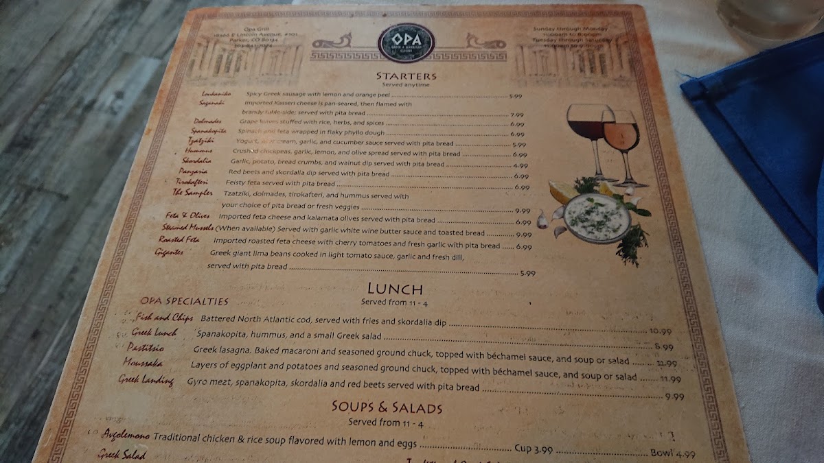 Located at 18366 Lincoln Ave, Parker, CO, Opa Grill is a delightful escape into the heart of Greek cuisine. Step inside, and you’ll instantly feel the warm embrace of hospitality that is as rich as the flavors they serve. Whether you're a devoted fan of Greek dishes or a newcomer curious to explore, Opa Grill welcomes you with open arms and a menu that reflects the authentic tastes of Greece.